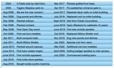 There is more detail of the development of Tiggins Meadow since our start in 2008 in our Blog , but a brief timeline is: