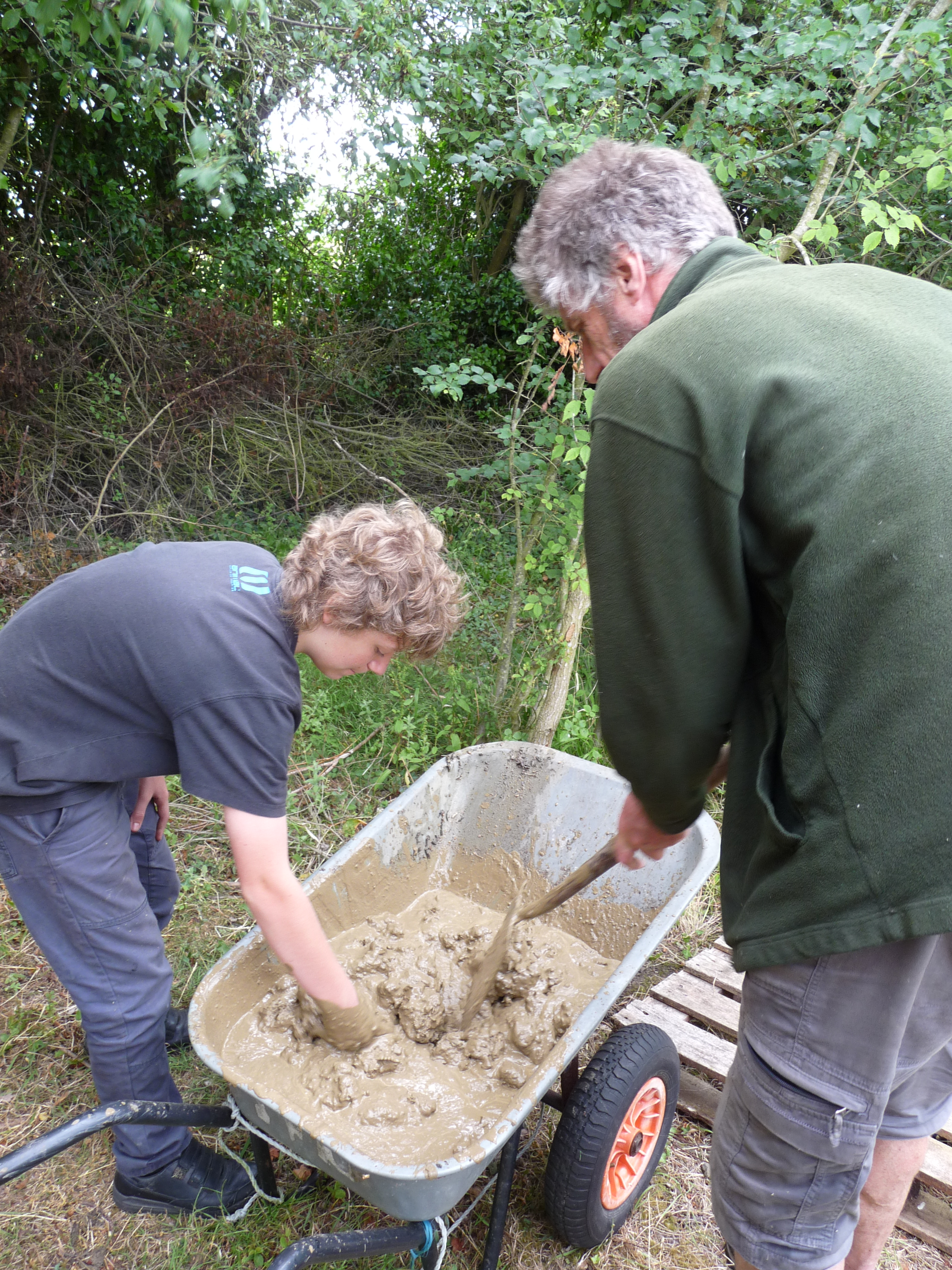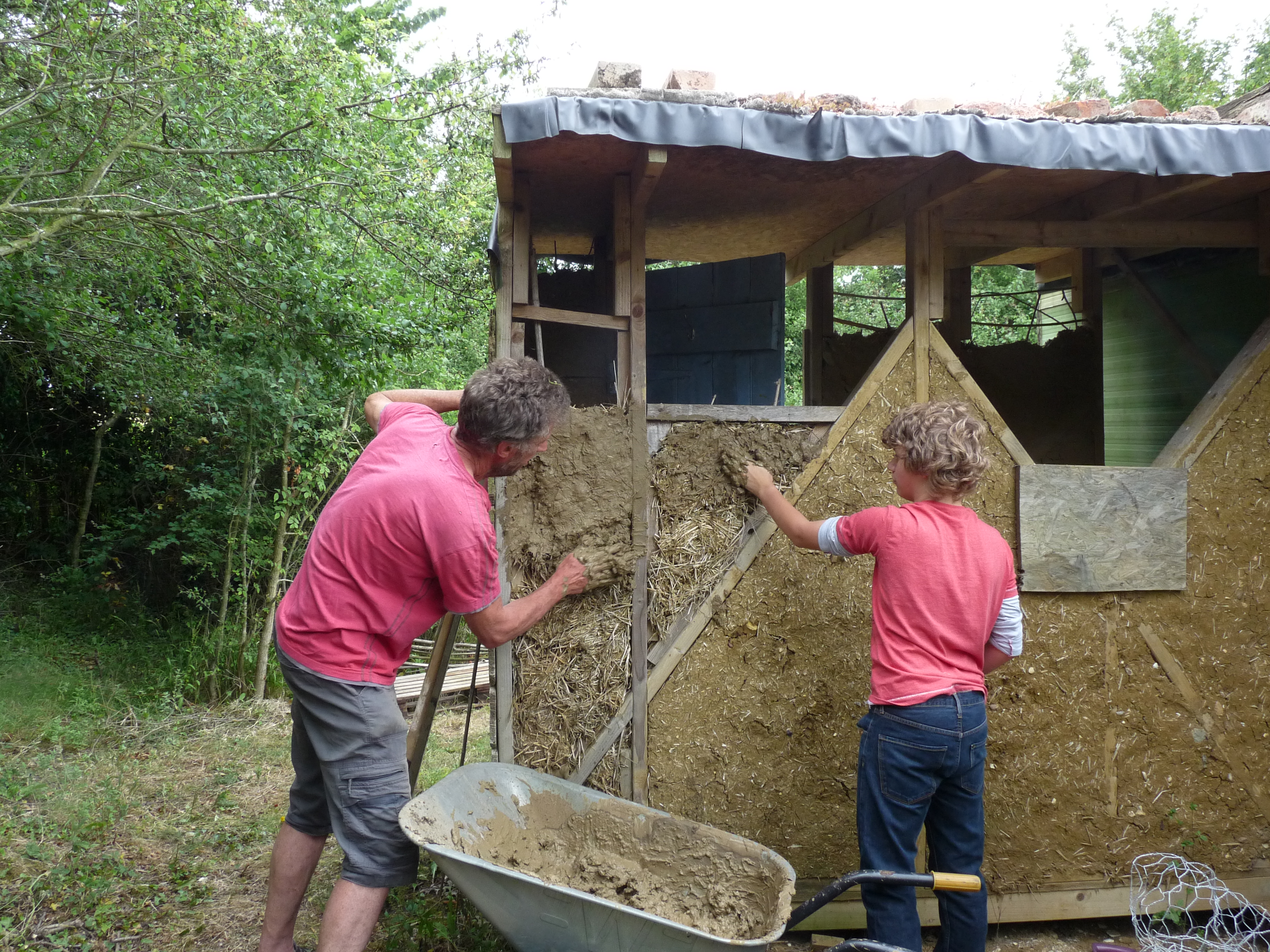 Last, but not least, we have a compost toilet on site. We are very experienced at maintaining this hygienically and it is not smelly to use, nor does it require lots of attention. Currently it is located in a small lean-to at the rear of the caravan in a building we built out of wattle (rods of willow cut on the field) and daub (a mixture of clay from the field mashed up with chopped straw). It was fun building it !